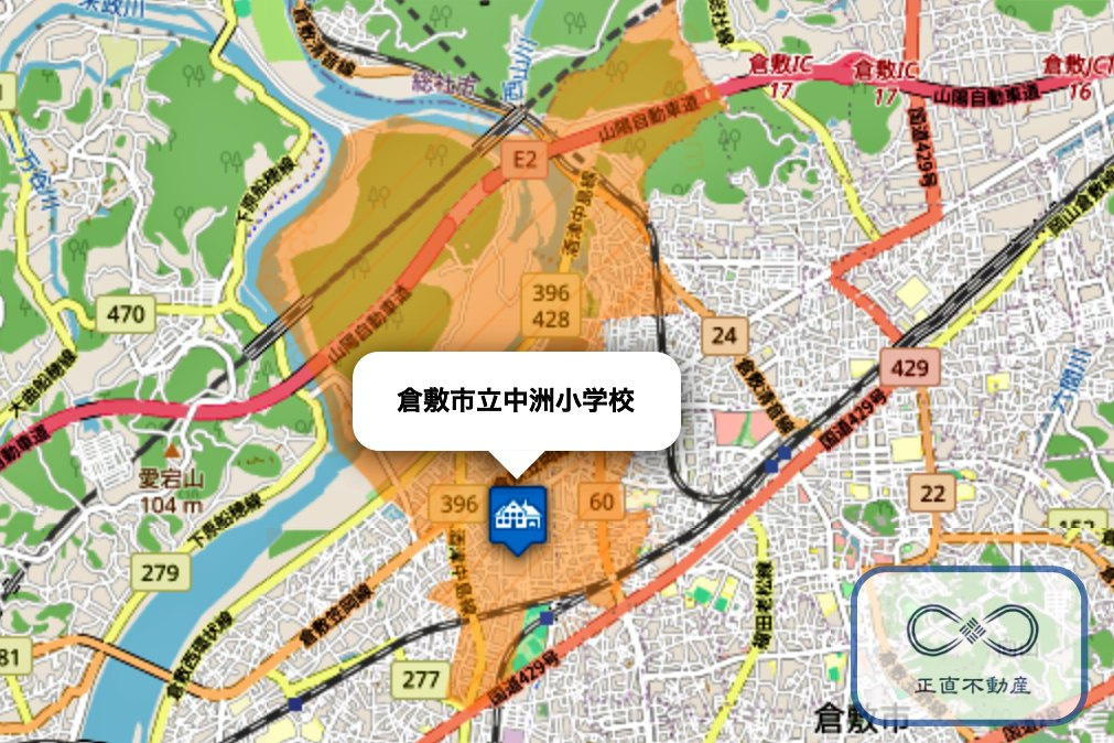 中洲小学校は、倉敷駅の西側に2300mの場所に位置しています。